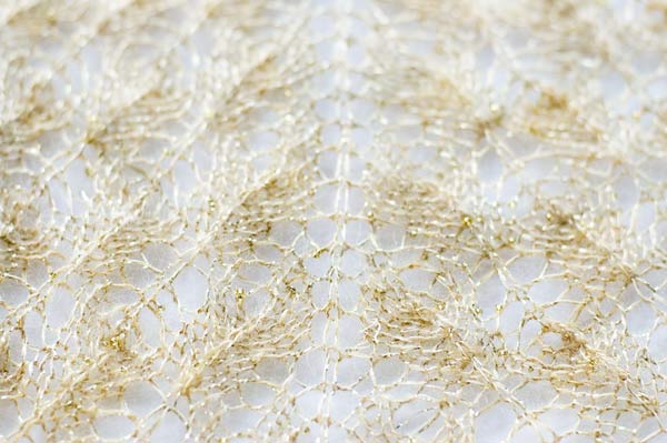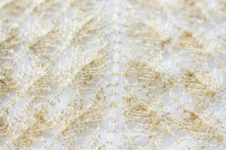 Beginner’s Lace Shawl in Tilli Thomas in Symphony Kid Lace with beads and glitter in goldenrod.