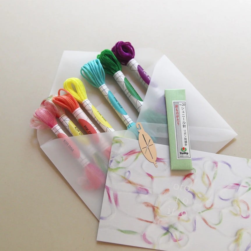 The Mini Ototoito Thread Set itself contains seven different Ototoito threads to try in miniature bundles, so you get a selection of different textures. The set also comes with an Ototoito threader, which was designed specifically to work with these threads, and a needle. For a simple way to compare how each of these threads looks in different stitches, the Ototoito Embroidery Thread + Stitch Sampler is a great tool (you can also use this to help sample and choose other threads for whatever project you plan to stitch next!)